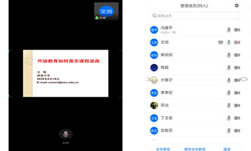 课程思政专题讲座特邀嘉宾是西南大学外国语学院院长文旭教授,讲座主题是:外语教育如何落实课程思政。文教授从课程思政的时代背景、课程思政的内涵、落实课程思政的举措以及全人教育等方面展开,特别强调了英语教师要有“四个自信”:职业自信、专业自信、理念自信、能力自信。讲座结束后,与参会教师进行了互动交流。