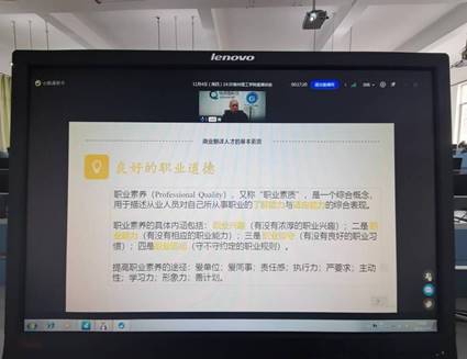 本网讯(外国语学院 李子宸)为培养学生创新创业能力,拓展学生素质,加深学生对翻译职业了解,更好地促进英语专业人才综合能力的提升,2021年11月4日,外国语学院特邀四川快译猫信息科技有限公司培训中心总监熊鹰为外国语学院全体学生作了题为“商业翻译人才的基本素质及其养成途径”的线上专题讲座。外国语学院全体学生通过网络方式集中聆听了讲座。