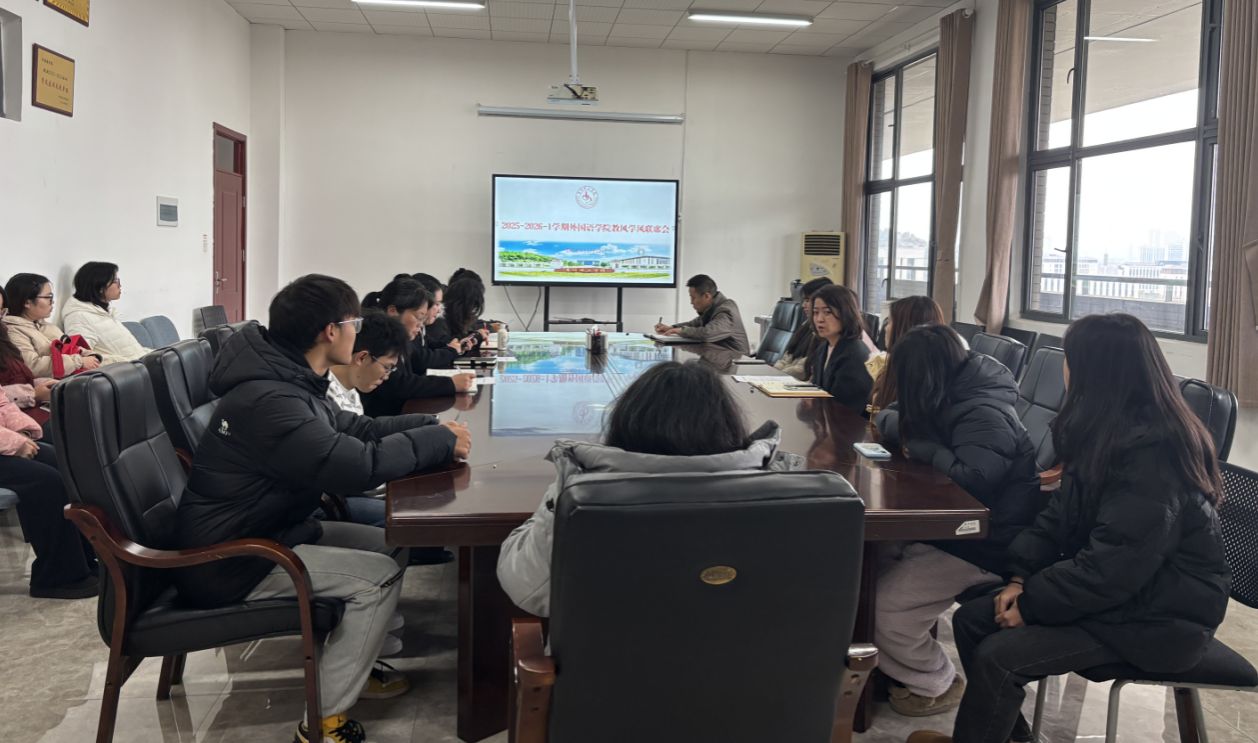 本网讯(外国语学院 黄超禹/王树梅)为进一步加强外国语学院学风建设,提升教学质量与学生管理效能,2025年12月22日中午,学院在开物楼1524会议室召开教风学风建设联席会。学院党总支副书记杜玉红、副院长冯建平以及学生科、教学科研科负责人、辅导员、全体班主任、各班级主要学生干部参会。