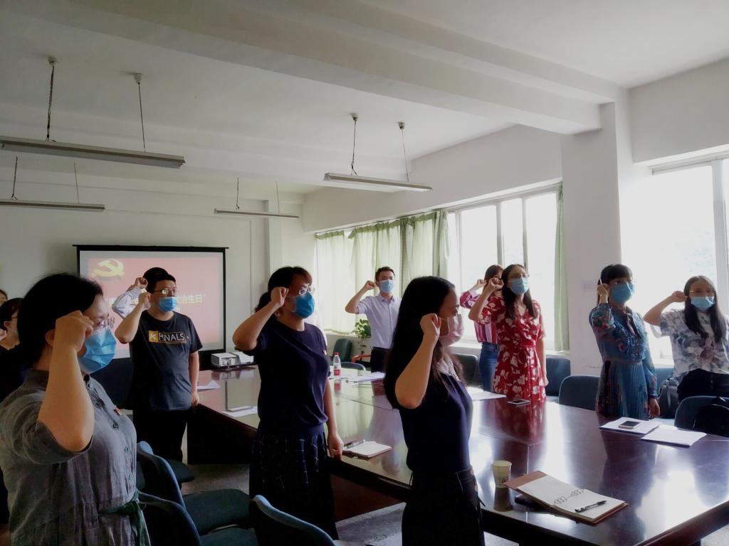 本网讯(外国语学院 彭立飞 报道)为庆祝中国共产党建党99周年,进一步增强党员身份意识、责任意识,谨记党员权利和义务,牢记“政治生日”,7月1日下午,外国语学院教师党支部在行政楼1102会议室开展了“重温入党誓词、过政治生日”主题党日活动。支部全体党员参加本次活动,重温入党誓词,对照入党誓词找差距,深入交流思想体会。学院党总支负责人程超同志主持活动。