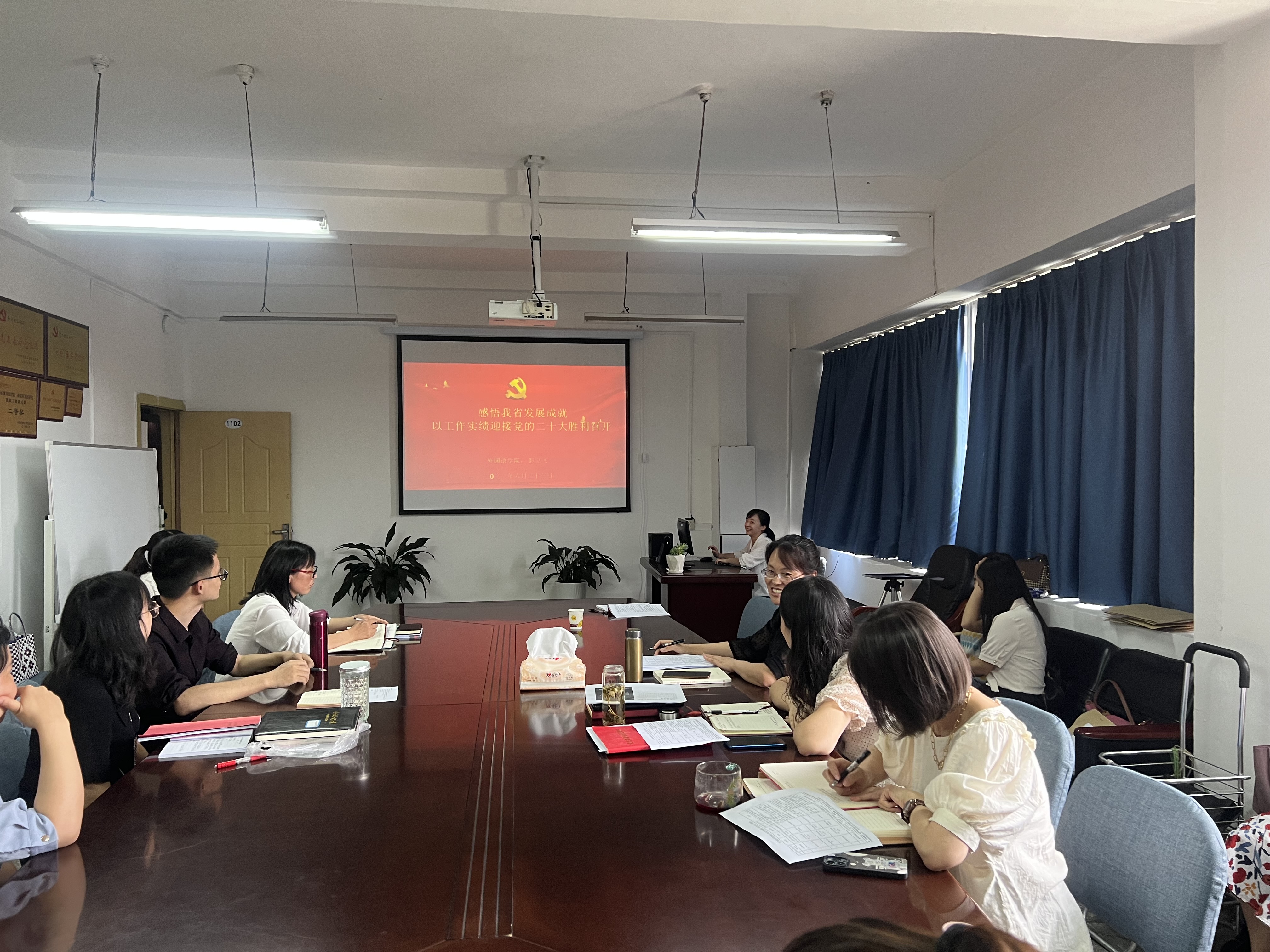 本网讯(外国语学院 张郁佳)2022年6月23日,外国语学院教师党支部组织开展了以“非凡十年我来讲 喜迎党的二十大”为主题的主题党日活动。活动由教师党支部书记冯建平主持,外国语学院全体党员参加。