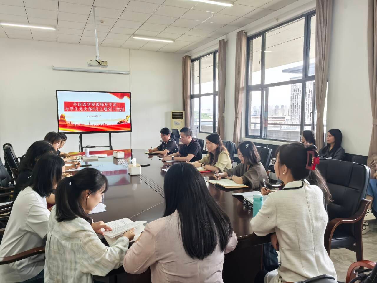 本网讯(外国语学院 邓冶)2025 年8月22日,外国语学院教师党支部与学生党支部在开物楼1524会议室开展了主题党日活动。会议由教师党支部书记李丽主持,外国语学院教师党支部与学生党支部全体党员参加。