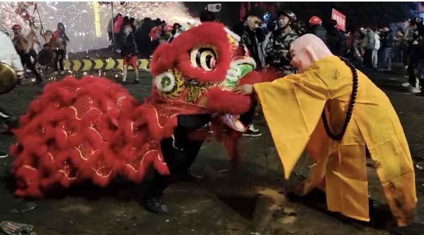 In the county,the dragons and lions gathered from the village; in the meanwhile, a great noise was made through the sound of gongs, drums and firecrackers.