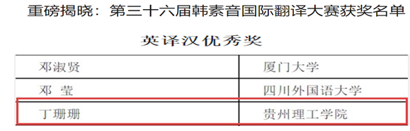 本网讯(外国语学院 周华北)2024年10月16日,第三十六届韩素音国际翻译大赛公布获奖名单。我院2021级学生丁珊珊同学在周华北老师的指导下,在英译汉项目中获得优秀奖。