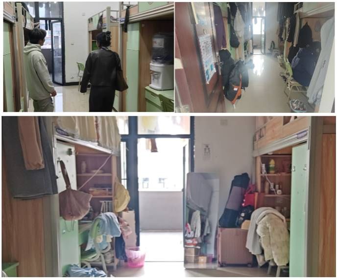 各班主任首先查看了“一站式”社区场地建设和运行情况,随后深入学生寝室细致查看了卫生与安全状况,重点检查了电源切断、门窗锁闭及有无遗留违禁物品等情况。每到一间寝室,班主任均与即将离校的同学们亲切交谈,仔细询问返乡行程安排,并反复叮嘱大家务必做到人离电断,锁好门窗,确保宿舍安全。同时,提醒同学们在假期中保持规律作息,注意人身财产安全,度过一个充实、平安的假期。