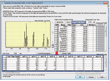 第2 步:创建“产物离子扫描”方法模板,确认每个化合物的定性结果正确后,点击“COAST”图标,勾选“产物离子扫描”,自动创建MS 表格,然后点击OK,自动生成产物离子扫描方法模板(图6)。