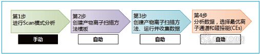 MRM 离子通道优化包含以下4 步,通常手动完成,耗时耗力,效果不佳。使用“MRM 优化工具”,则除第1 步手动完成外,其余3 步均可自动完成,实现了方法建立最大程度的自动化(图4)。