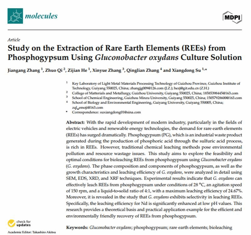 分析测试中心张建刚老师在国际知名学术期刊《Moleculus》(中科院二区,影响因子IF=4.6)上发表题为《Study on the Extraction of Rare Earth Elements (REEs) from Phosphogypsum Using Gluconobacter oxydans Culture Solution》研究论文,并被Web of Science数据库检索。