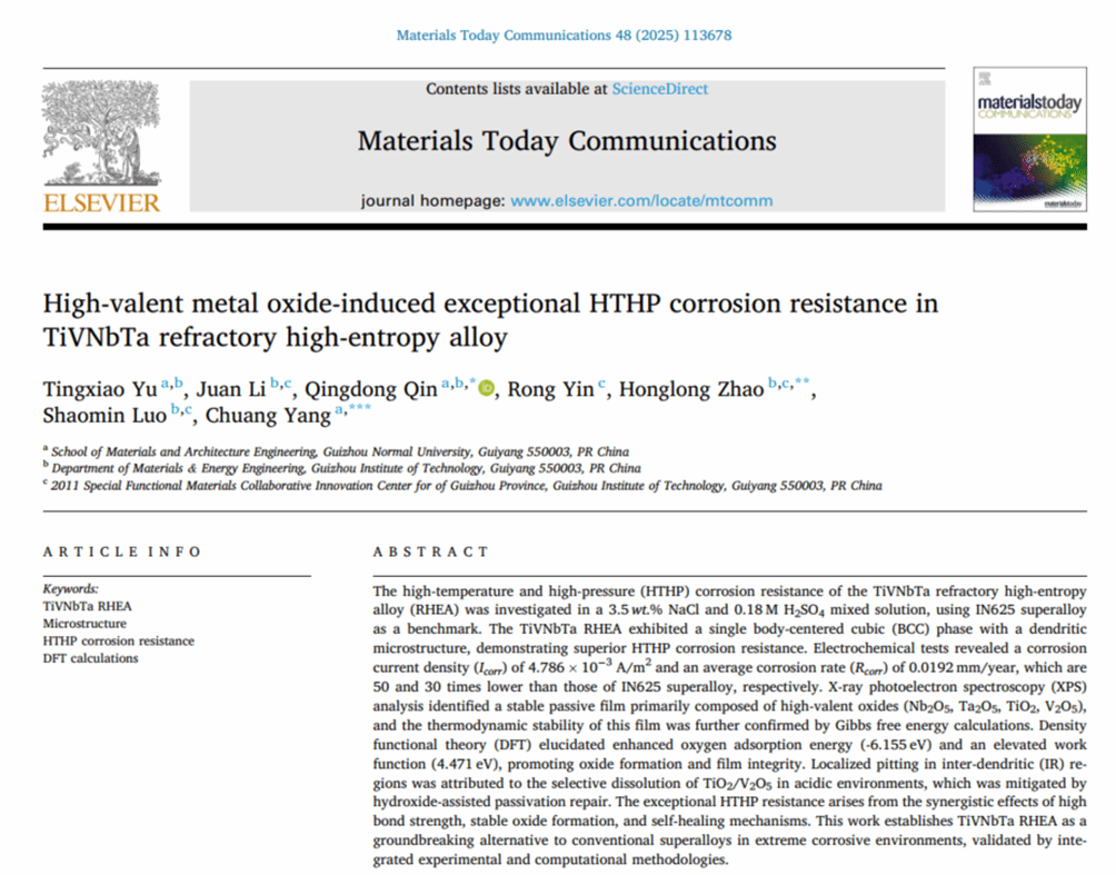 分析测试中心赵宏龙老师在国际知名学术期刊《Materials Today Communications》(JCR2区,影响因子IF=4.5)上发表题为《High-valent metal oxide-induced exceptional HTHP corrosion resistance in TiVNbTa refractory high-entropy alloy》研究论文,并被Web of Science数据库检索。