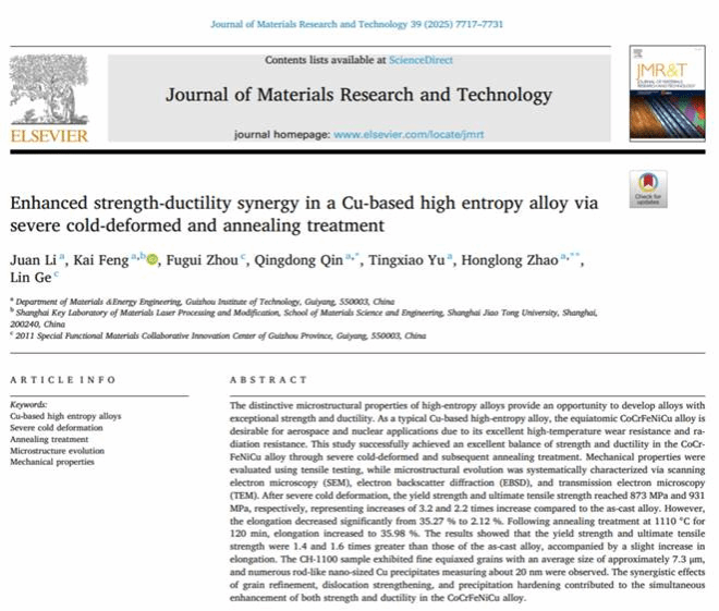分析测试中心赵宏龙老师在国际知名学术期刊《Journal of Materials Research and Technology》(JCR1区,中科院二区,影响因子IF=6.6)上发表题为《Enhanced strength-ductility synergy in a Cu-based high entropy alloy via severe cold-deformed and annealing treatment》研究论文,并被Web of Science数据库检索。