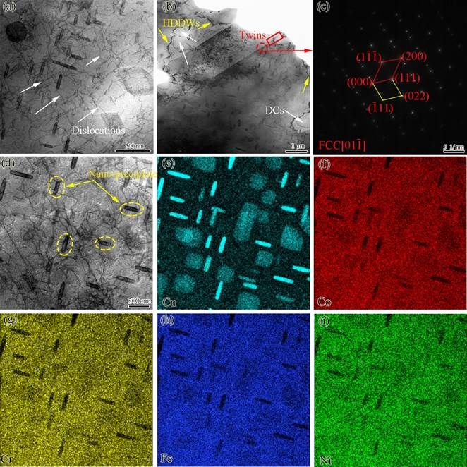 高熵合金(High entropy alloy,HEA)因其独特的物理、化学以及力学性能,极大地拓展了金属材料成分设计范围,有望在国防、航空、航天、海洋、核能、医疗、新能源等重大工程领域发挥重要作用。以Cu基CoCrFeNiCu高熵合金为研究对象,通过大塑性变形和热处理引入变形孪晶和纳米析出相,解决了Cu基高熵合金强塑性倒置难题,为高高熵合金的塑性加工和工程化应用提供了理论支撑。