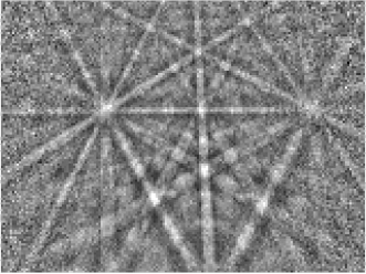 具体过程就是通过 Hough 变换识别磷屏获取的衍射花样中的各个条带及位置,测量并计算各个衍射条条带之间的夹角,然后与所分析相的晶面夹角列表比对,而列表基于所输入相中一系列特定的反射面,给出匹配度最高的解, 最后计算出取向矩阵获得取向信息。