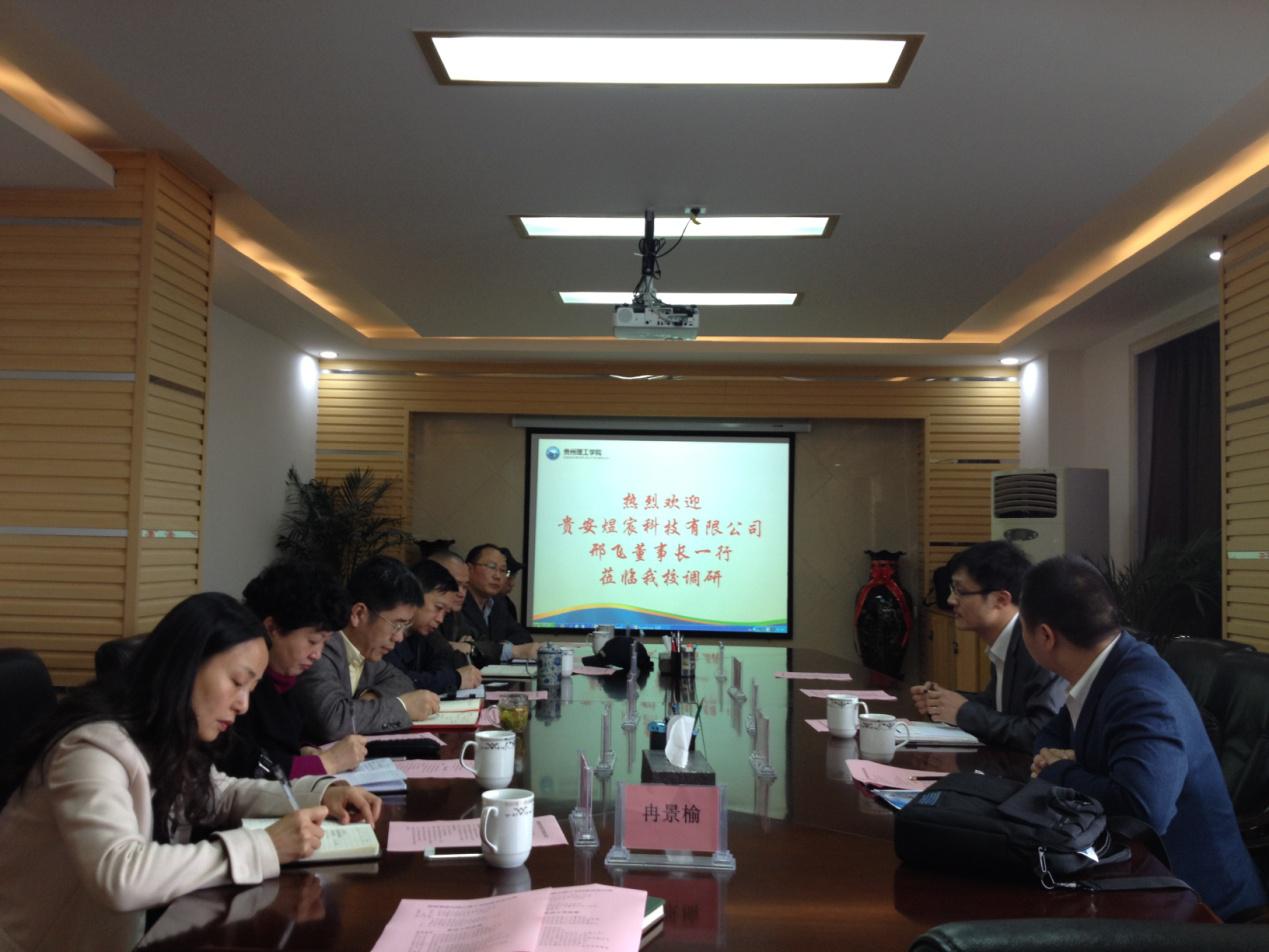 本网讯(发展规划与对外合作处 冉景榆)继我校于2015年1月与贵安煜宸科技有限公司签订战略合作框架协议后,4月24日上午,该公司董事长邢飞一行来校调研,校长龙奋杰、副校长梁杰,以及发展规划与对外合作处、科研处、工程实训中心、校团委、机械工程学院等部门(单位)负责人参加座谈,双方就如何进一步推动实质性合作进行深入交流。会议由龙奋杰校长主持。