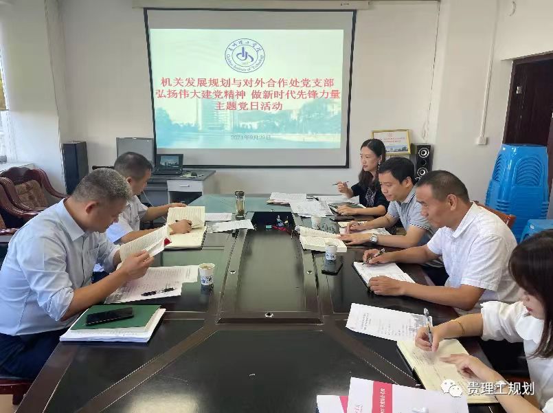2021年9月29日上午10:00机关发展规划与对外合作处党支部全体党员同志在行政楼328会议室召开“弘扬伟大建党精神 做新时代先锋力量”主题党日活动。活动由支部书记彭勇主持,支部全体党员同志及入党积极分子参加。