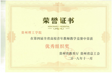 (本网讯 燕梓)2018年7月12-16日,贵州省第四届高校青年教师教学比赛在贵州理工学院落下帷幕,近日我校喜获竞赛优秀组织奖证书。它是我校历年参加贵州省高校青年教师教学竞赛中,首次获得优秀组织奖。