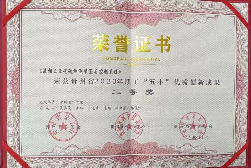 近日,由校工会推送的化学工程学院吴其俊教师团队研制发明的《液相三氧化硫检测装置与控制系统》,获贵州省总工会、省科学技术协会和省质量协会共同组织开展的贵州省2023年职工“五小”优秀创新成果评选活动创新成果二等奖。这是我校近五年首次获此荣誉。