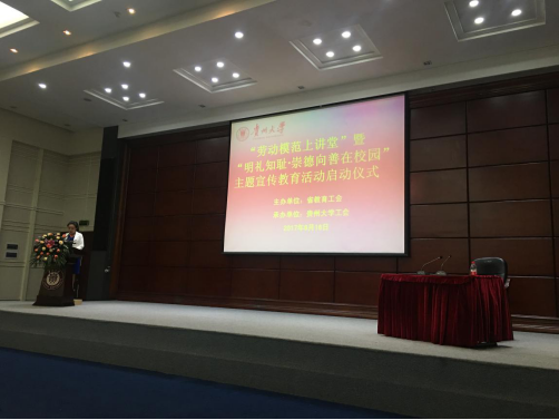 为了大力弘扬劳模精神,扎实推进职工思想道德建设,继续打造好“劳动模范上讲堂”这个工会工作的品牌,省教育工会6月16日下午在贵大北校区举行了2017年“劳动模范上讲堂”暨“明礼知耻·崇德向善在校园”主题宣传教育活动启动仪式。我校工会参加了本次启动仪式。