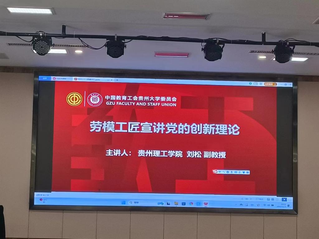 11月3日,在美丽的红枫湖畔,我校”最美劳动者”、航空航天工程学院团总支书记、副教授刘松同志,受邀以“笃行不怠守初心·砥砺奋进新征程”为主题,向贵州大学工会优秀干部、“全国三八红旗手”“全国五好家庭”获得者等80余人宣讲党的创新理论,就其多年进行乡村振兴工作的经验与思考和大家进行交流,并以其务实、富有成果的工作展现了贵州理工学院教职工的良好风貌。
