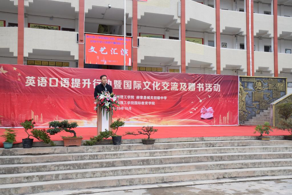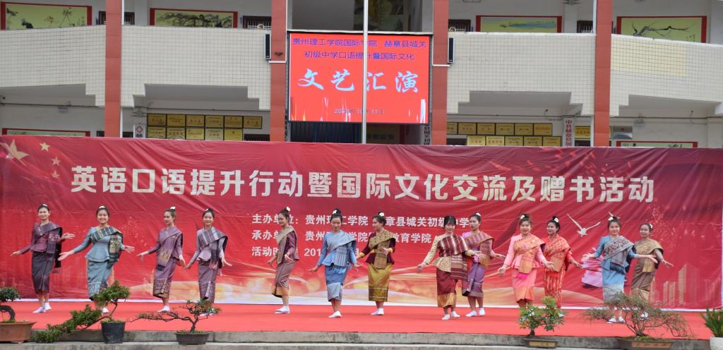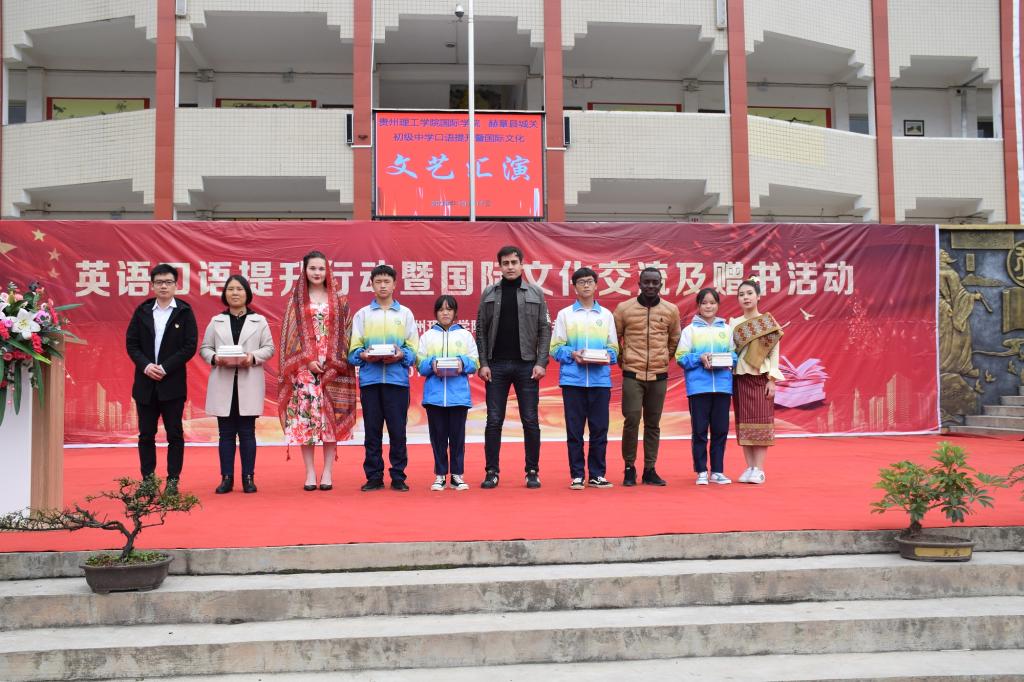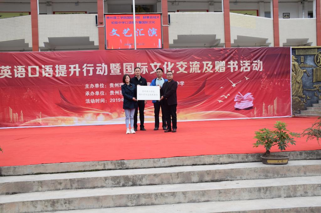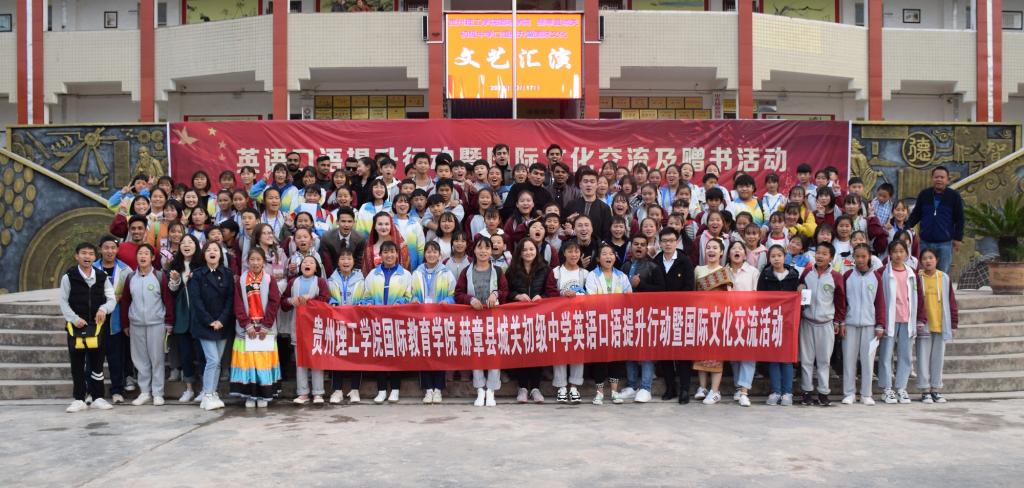 本网讯(国际教育学院 图/唐春天 文/陈洲)为进一步贯彻落实中央、省委及学校党委部署,经过前期调研和准备,国际教育学院党总支充分发挥自身特色和优势,组织国际学生于第六个全国扶贫日(10月17日),走进赫章县城关初级中学,开展教育扶贫。17日,国际教育学院和赫章县城关初级中学联合开展了“英语口语提升行动暨国际文化交流及赠书活动”。