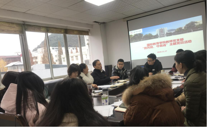 根据《关于开展“防风险、守底线”主题党日活动的通知》(贵理工组通〔2020〕41号)文件要求,11月27日,国际教育学院教师党支部在主楼328室开展了“防风险 守底线”主题党日活动,深入学习习近平新时代中国特色社会主义思想,认真学习党的十九大精神和习近平总书记关于防范化解重大风险系列重要论述,进一步深化认识、统一思想;紧密结合自身工作职责,对照全省警示教育大会上“五个问一问”的工作要求,认真学习、查摆问题。