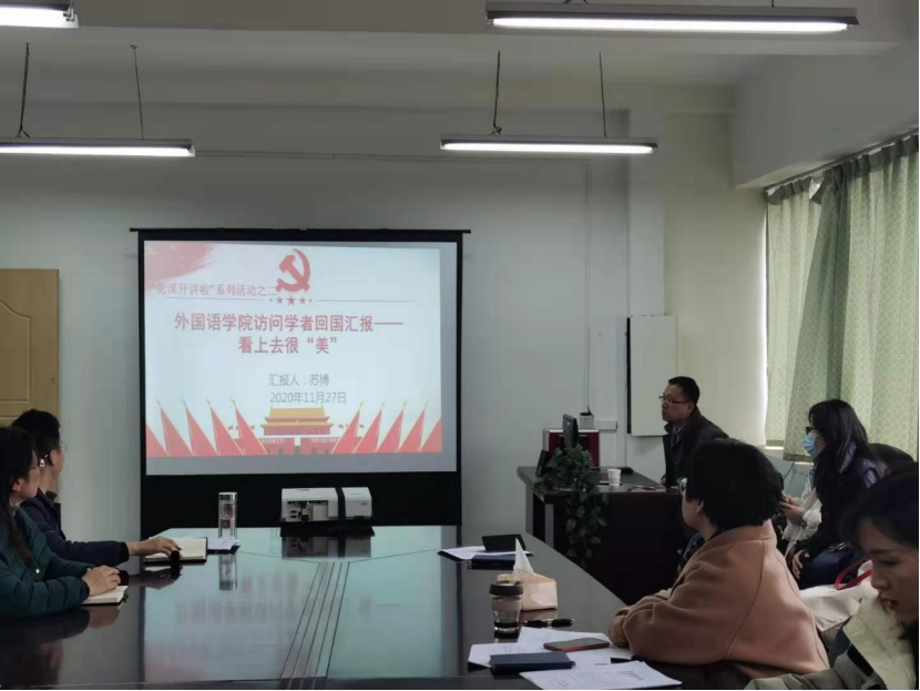 (国际交流与合作处 汤王海)我校国际交流与合作处高度重视国家留学基金委公派出国项目,严格按照国家留学基金委要求对公派出国留学教师进行管理。2020年11月27日,我校外国语学院访问学者苏博副教授在我校行政楼11楼会议室开展了主题为《看上去很美》的归国汇报演讲。作为国家留学基金委资助的访问学者,按照国家留学基金委的相关要求,苏博副教授返校后对本学院所有教师开展了第一次演讲。