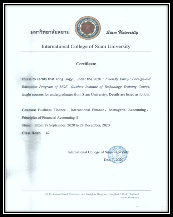 受新冠肺炎疫情影响,泰国暹罗大学学生不能按时入境接受培训,经我校与教育部及泰方协商后达成一致意见,将此次培训形式调整为线上培训,2020年9月至12月,我校选派经济管理学院优秀教师为泰国暹罗大学本科生及研究生进行线上教学,国际交流与合作处、国际教育学院录播贵州文化体验课,保证了此次“友好使者”培训计划高质量圆满完成。