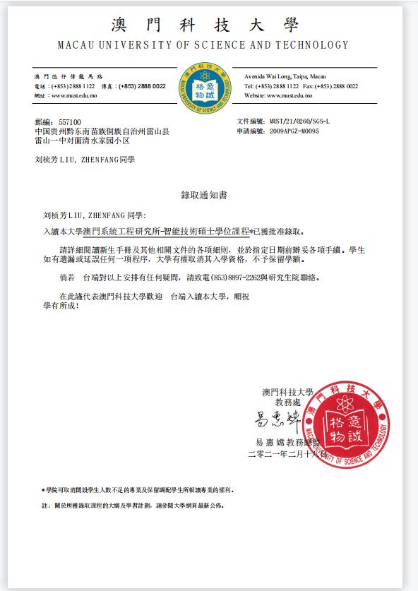 (本网讯 文/卢朦朦 刘桢芳)2016年至2021年,我校共有14名(2017年2名、2018年2名、2020年5名、2021年目前已录取5名,第二批还在录取中)优秀应届毕业生通过此项目以保荐生身份赴澳门科技大学研究生院深造,为使我校师生全方位了解“贵州理工学院•澳门科技大学保荐项目”,让更多贵理工学子有机会赴澳科大研学,贵理工国际交流与合作处公众号从本月开始,将特别推出贵州理工学院•澳门科技大学保荐项目:2021年录取新生系列报道、历年录取学生读研感悟报道、已毕业学生就业去向报道,以彰学风!