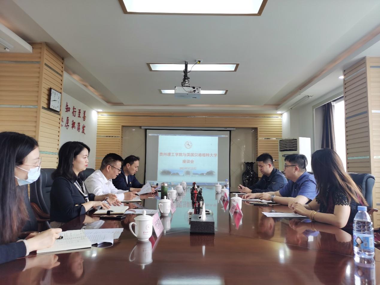 (本网讯 图/ 欧阳宇娟 文/代清萌)5月21日下午,英国贝德福特大学驻中国办公室主任Colin Wang一行三人来访,我校在综合楼第二会议室召开了座谈会。贵州理工学院副院长胡兴灿出席会议,党委办公室以及国际教育学院相关工作人员参加会议。会议由贵州理工学院国际教育学院党总支副书记章丽娥主持。