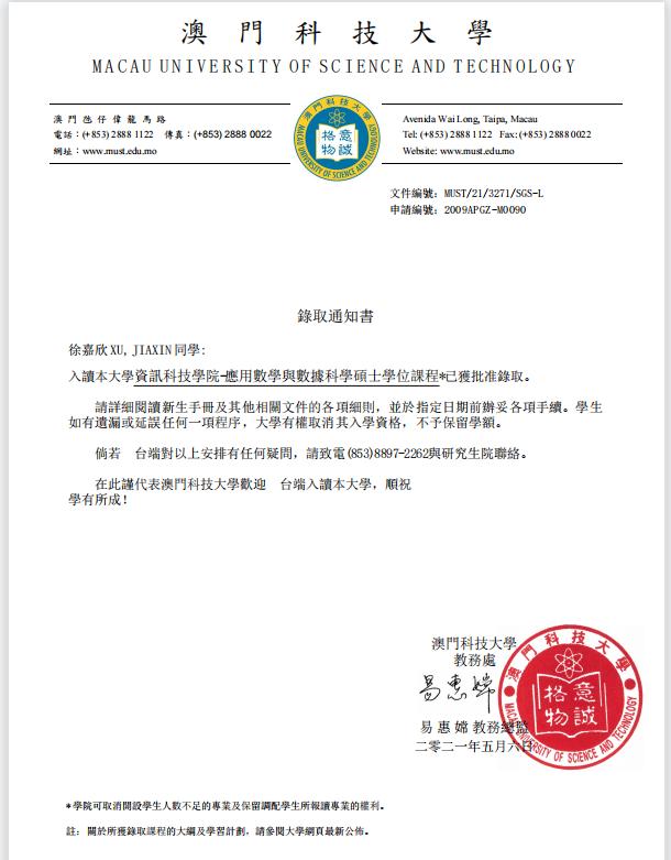 我认为从网申到收到录取通知的整个过程需要一定的耐心,在网申阶段,应认真填写和上传文件,面试时也应提前准备好软件,我面试的过程中出现了一点小插曲,距离面试结束还有十分钟时才进入线上面试房间,在面试过程中遇到任何问题都可以向国际处卢老师寻求帮助,然后耐心解决问题。澳科大在选拔和面试的过程中是很公平公正的,特别是进入面试以后,在面试老师眼中,每个同学都是同一个起跑线,所以大家不用担心会和名校的同学竞争占劣势,自己好好准备面试问题,建议大家着重准备与报考专业相关的基本知识和英语自我介绍,面试过程中也应保持礼貌和尊重,不慌不忙、坚定自信地展示自己!