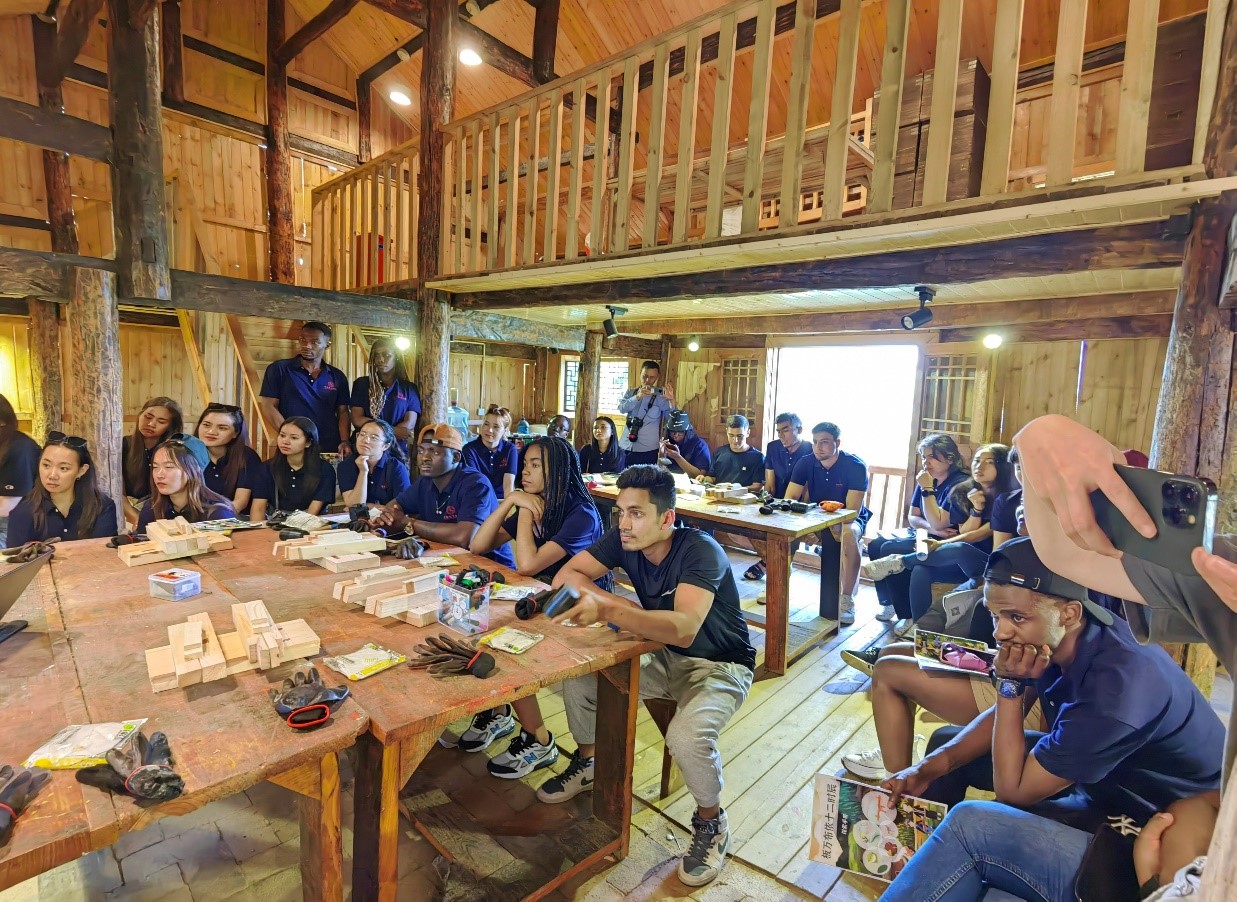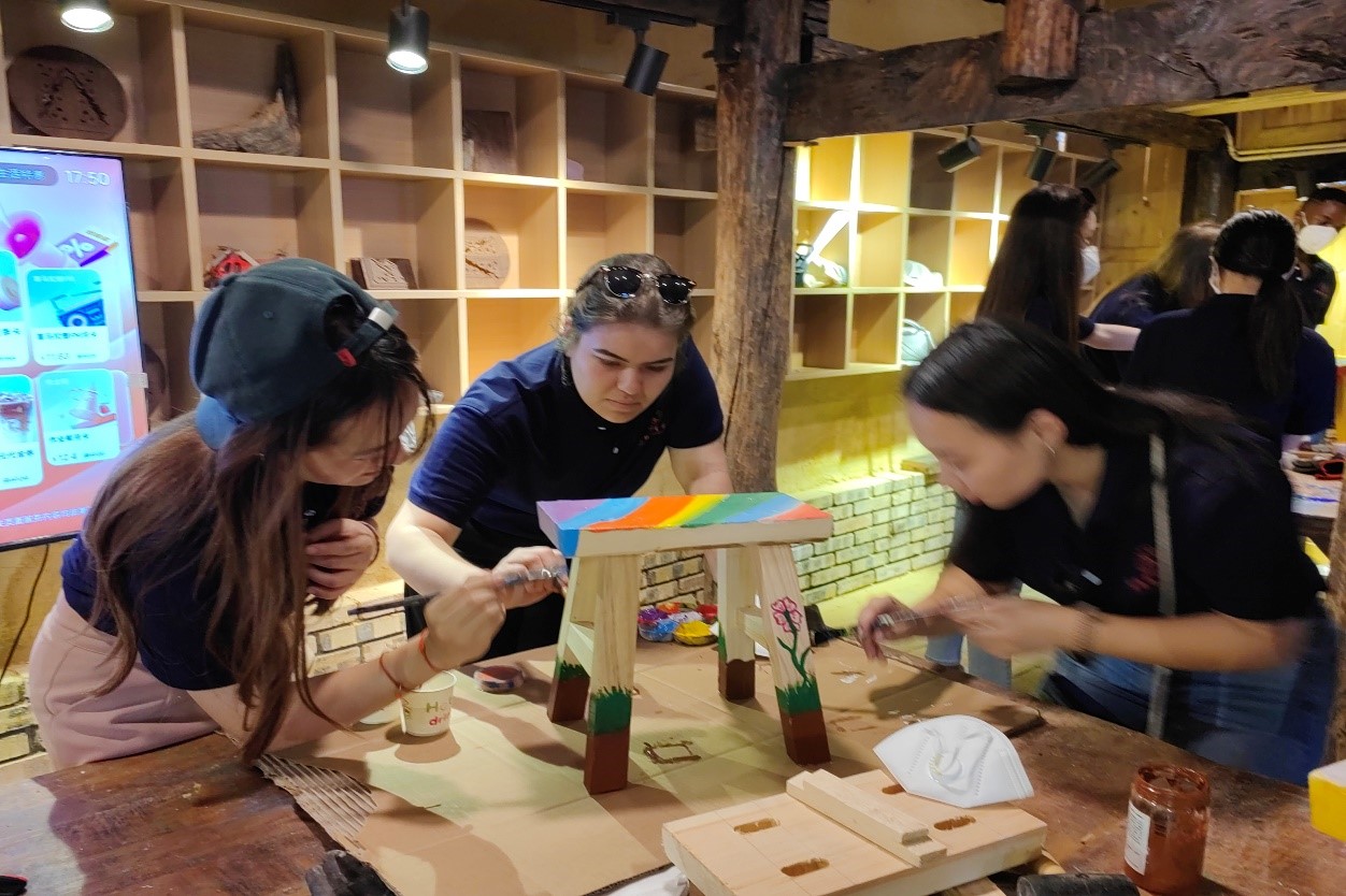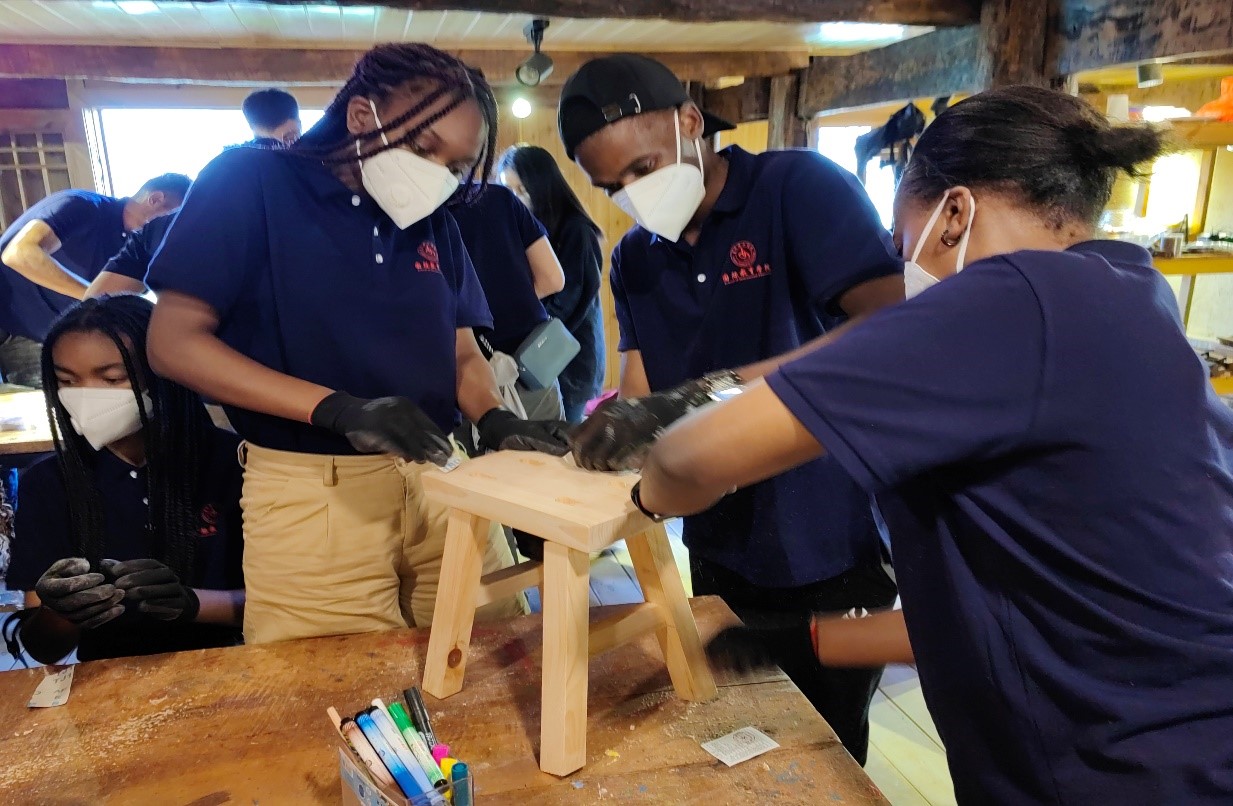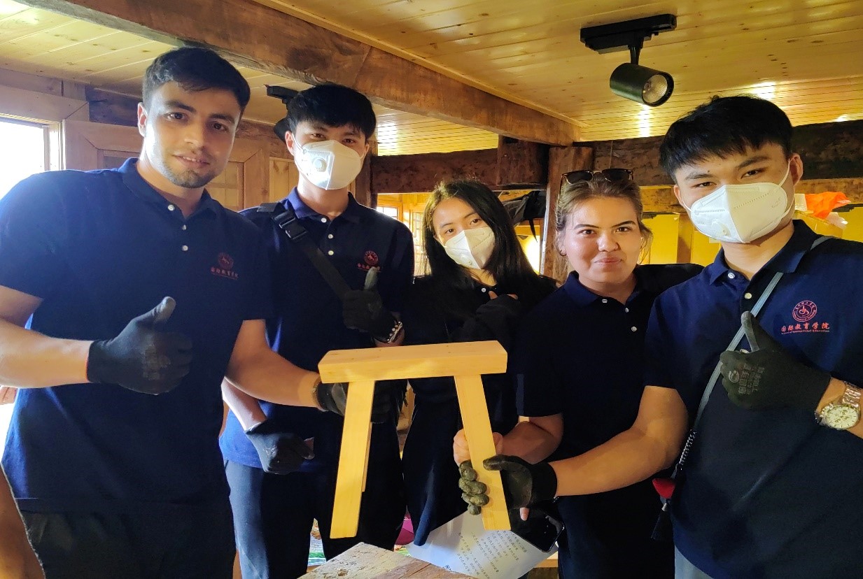 随后同学们参观了最传统的布依族干栏式民居,学习了解布依族建筑历史和文化,并亲手拼接、打磨、上漆,创作了属于自己小组的榫卯结构小凳。