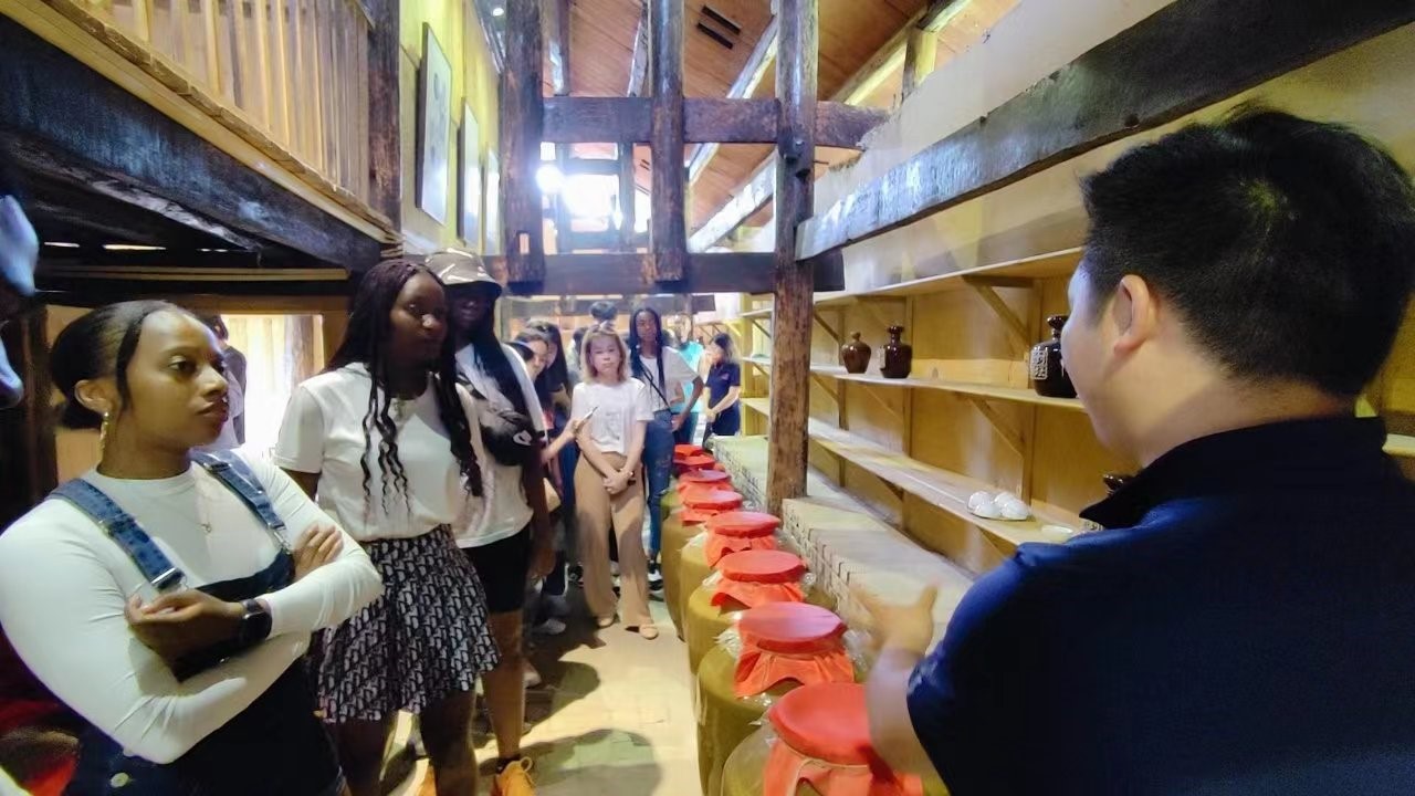 第二天,同学们在酿酒坊和美食坊学习了解了布依美酒的酿造技艺和布依五色花米饭的制作过程,并一起打糍粑。来自老挝的金凤、美丽莎等同学在与村民交流时发现,自己能听懂一些布依语,他们纷纷表示,来到这里就像见到了自己的亲人、回到了自己的家乡一样,感觉特别亲切,同时也希望自己的家乡也能像板万一样发展起来。