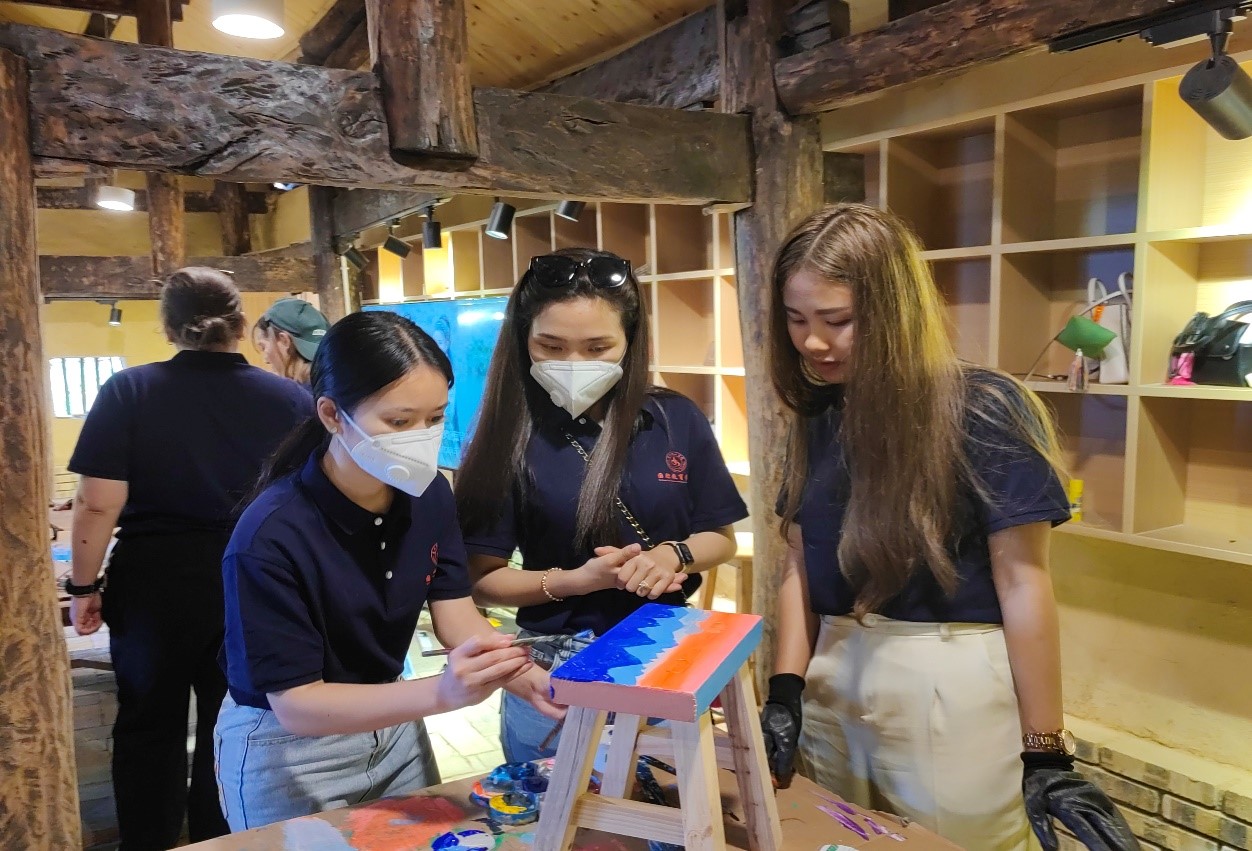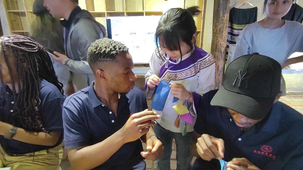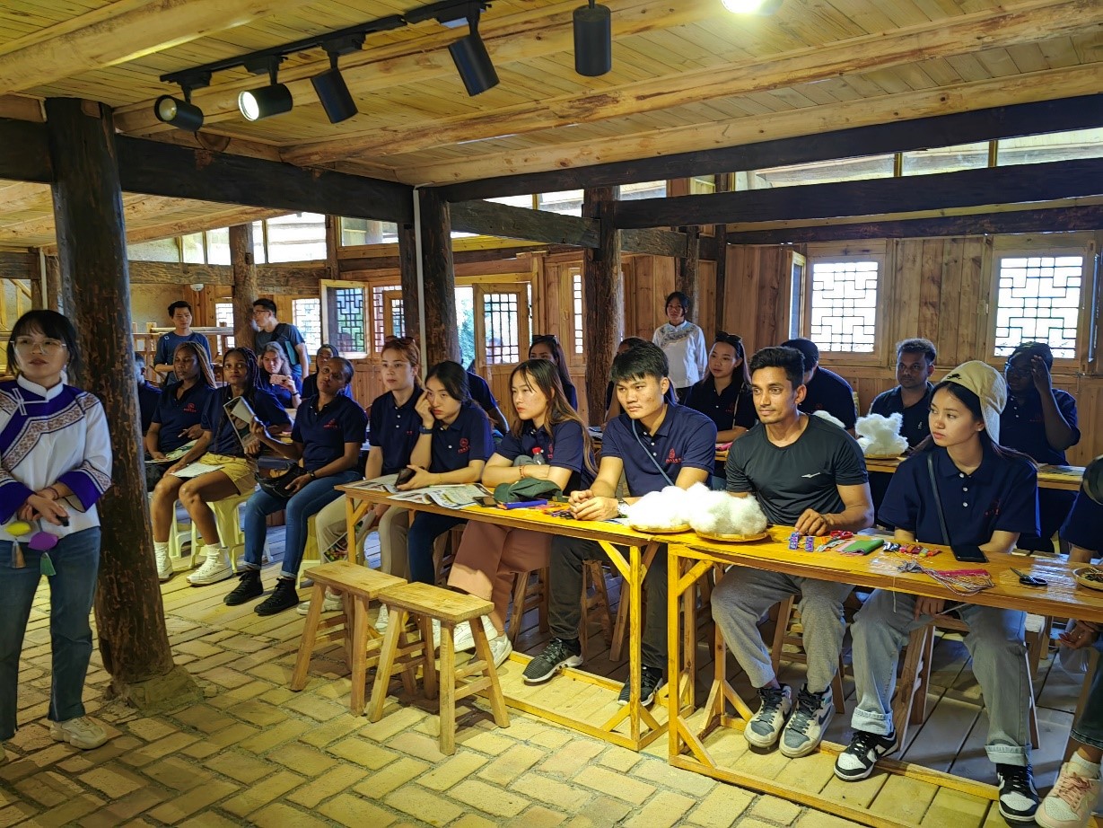 在板万锦绣坊,当地绣娘为国际学生介绍了布依族服饰的特点,在绣娘的指导下,同学们体验了布依传统的康包制作。