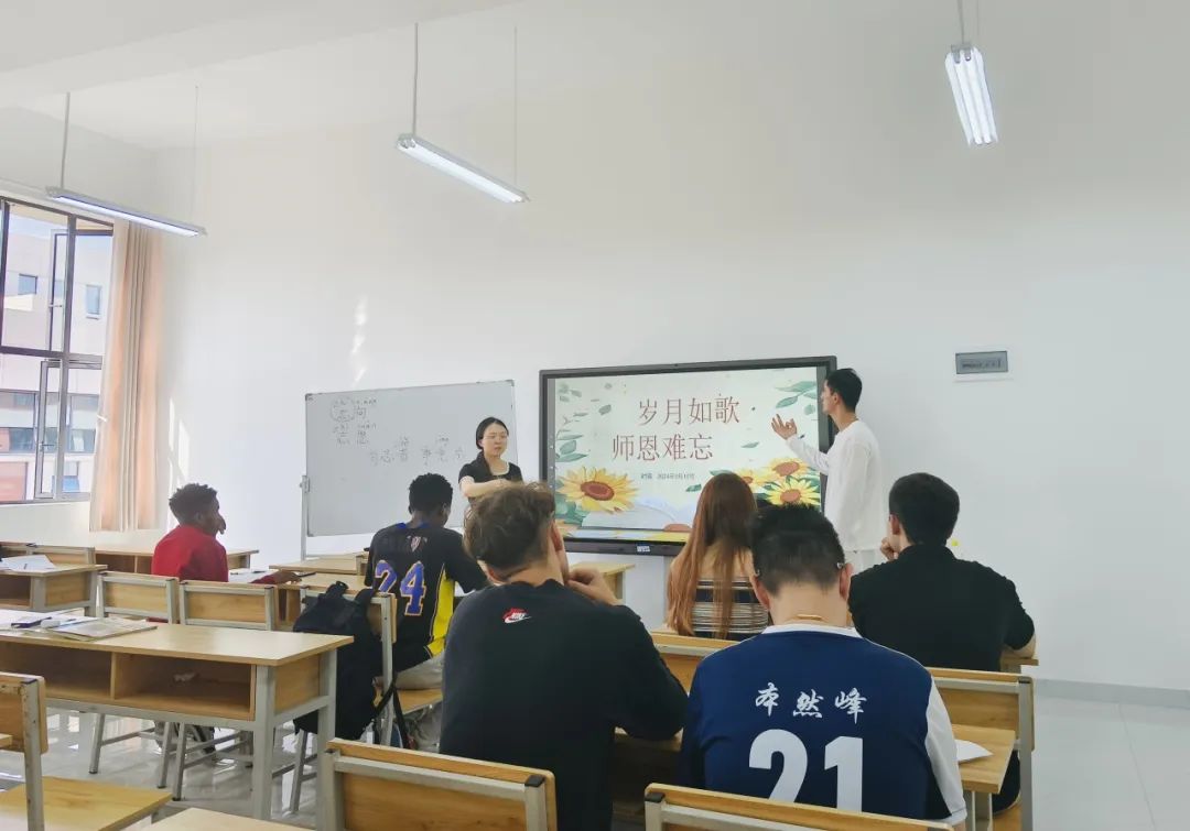 来自塔吉克斯坦的大卫说“一开始,来到国际教育学院,我们就像一群懵懂的孩子,是老师们用耐心和爱心,引领我们走进知识的殿堂”,自俄罗斯的莉娜说“老师们,您们的辛勤工作和无私奉献让我们感受到了家的温暖”;在校的国际学生们说“在这个属于老师们的节日里,我们想对老师们说一声:谢谢你们!祝老师们教师节快乐,身体健康!”。9月10日下午,学院的国际学生们组织了“岁月如歌,师恩难忘”感恩活动,231、232班国际学生们在课堂上纷纷表达了对老师的感激之情和节日的祝福。一幕幕温馨的画面,一句句真挚的话语,让在场的每一个人都深受感动,整个教室洋溢着浓浓的师生情谊。