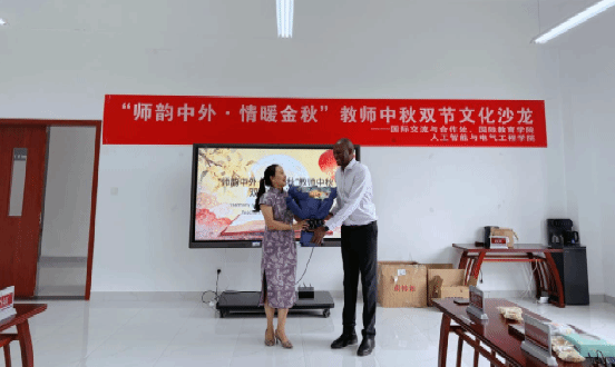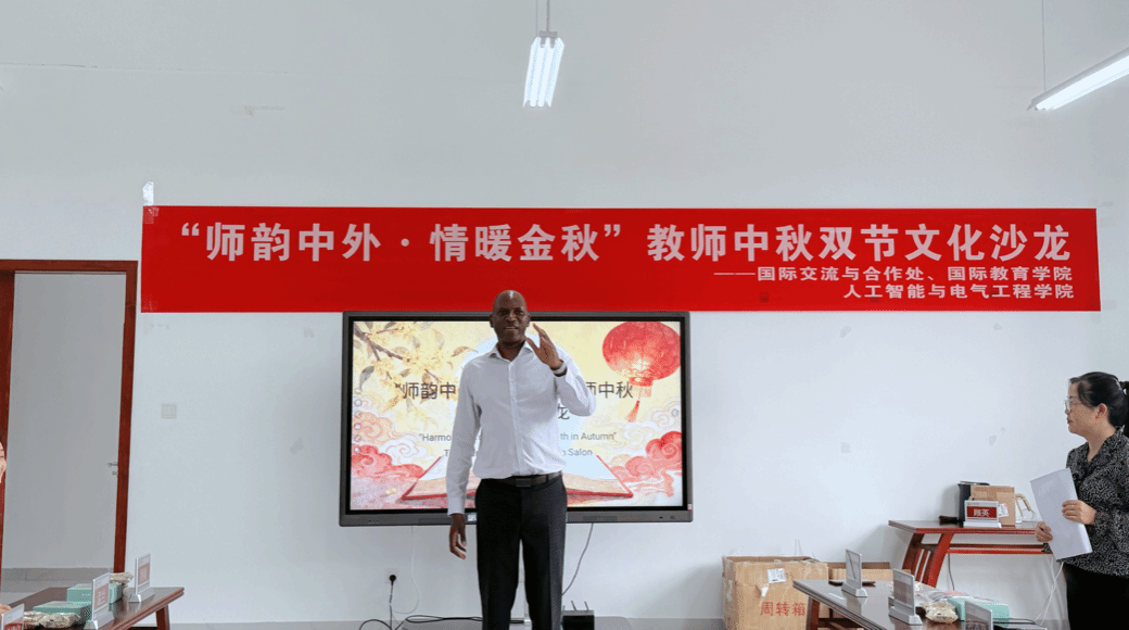 金秋送爽,桃李盈香。为推动教育外事工作与中外人文交流的深度融合,给我校国际化办学事业注入文化活力,9月12日下午,“师韵中外·情暖金秋”教师中秋双节文化沙龙在致知楼407文化活动室温馨启幕。国际交流与合作处处长、国际教育学院院长乔靖,国际教育学院党总支书记吴维义、副院长徐丽丹,人工智能与电气工程学院党总支书记孟兰、副院长张均,英国贝德福特大学外籍教师Phillip Hushani出席活动,国际教育学院、人工智能与电气工程学院相关师生参加活动,活动由国际教育学院副院长徐丽丹主持。
