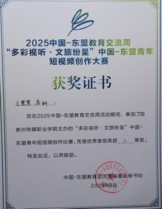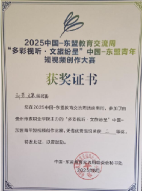 近日,2025中国-东盟教育交流周“多彩视听·文旅纷呈”中国-东盟青年短视频创作大赛落下帷幕,我校在赛事中表现良好,获得2个二等奖和最佳组织奖。