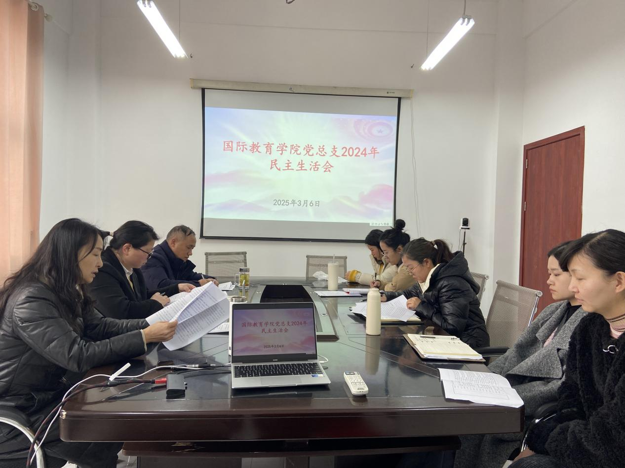 2025年3月6日下午,国际教育学院党总支领导班子在致知楼召开2024年民主生活会,学院党总支领导班子成员和各科室负责人参加会议。学校民主生活会督导组第五组组长胡德慧同志到会指导并作点评。