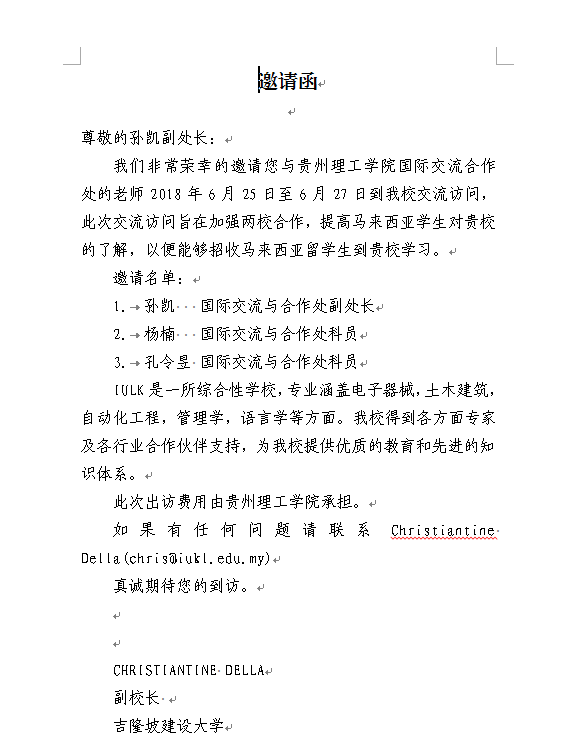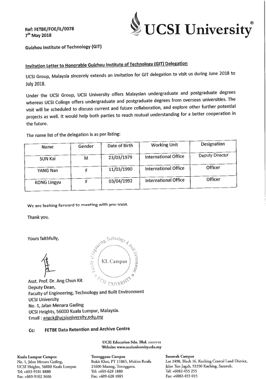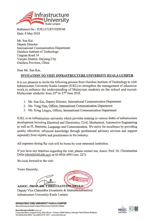 根据中央、国务院出台的因公出国(境)管理工作有关规定,现对贵州理工学院孙凯等3人赴马来西亚执行交流访问及留学生招生宣传任务公示如下: