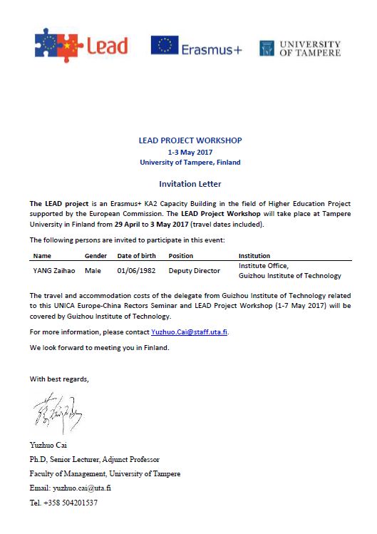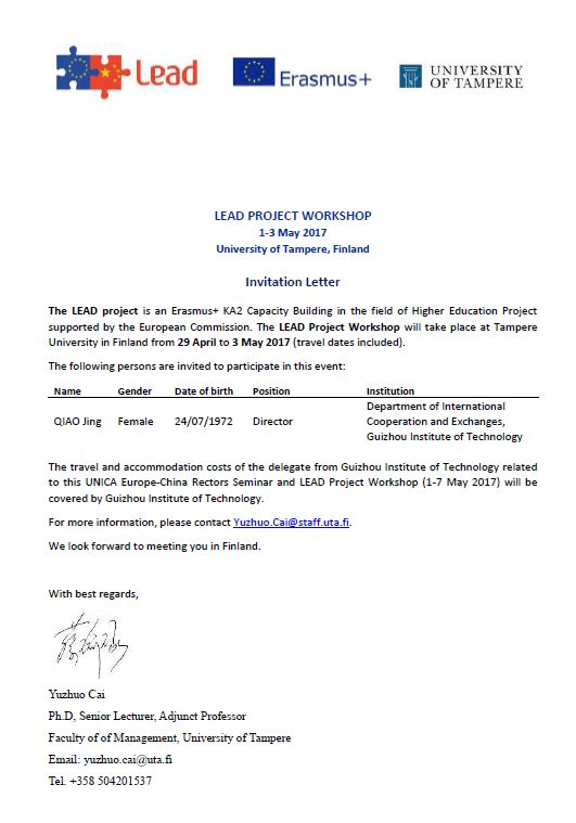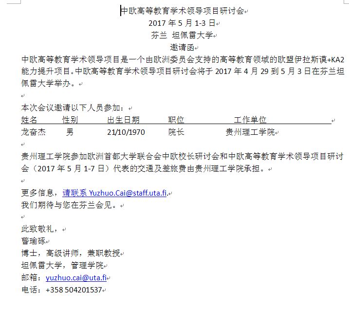 根据中央、国务院出台的因公出国(境)管理工作有关规定,现对贵州理工学院龙奋杰等3人赴芬兰及葡萄牙执行参加由“中欧高等教育学术领导项目”举办的“中欧大学校长研修班”任务公示如下: