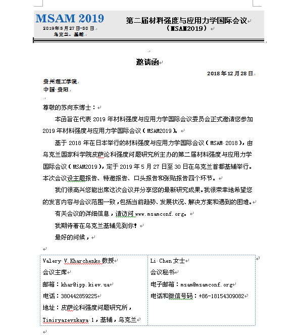 上午:参加2019年第二届材料强度与应用力学国际会议开幕式 下午:听取会议主题报告及特邀报告 |