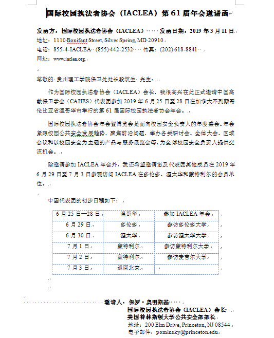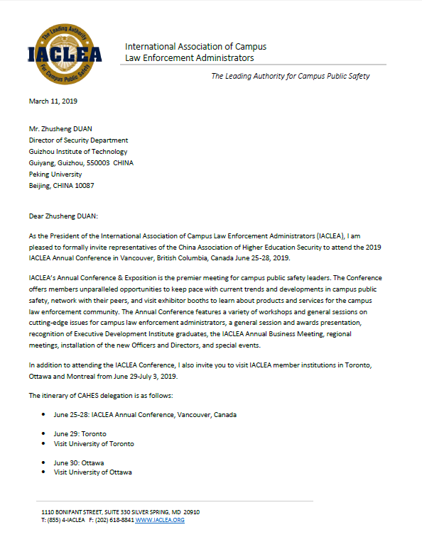 国际校园执法者协会(IACLEA)是1958年11月由美国11名高校保卫部长发起建立,主要目的为探讨工作中遇到的挑战和存在的共同问题,并协商提出解决方案。目前总部位于美国佛罗里达州州立大学,会长为保罗.奥明斯基。中国高等教育学会保卫学专业委员会于1998年12月向公安部、教育部申请加入协会,并于1999年批准同意加入。中国高等教育学会保卫学专业委员会自1999年来均以会员资格派代表出席每年年会。 |