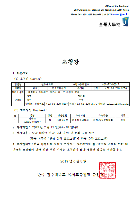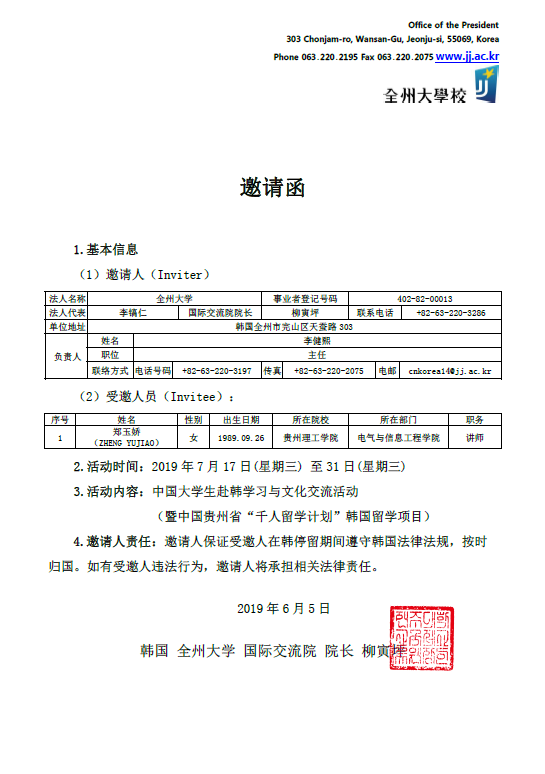 作为贵州理工学院参加2019年贵州省“千人留学计划”学生的带队教师赴韩国全州大学 |