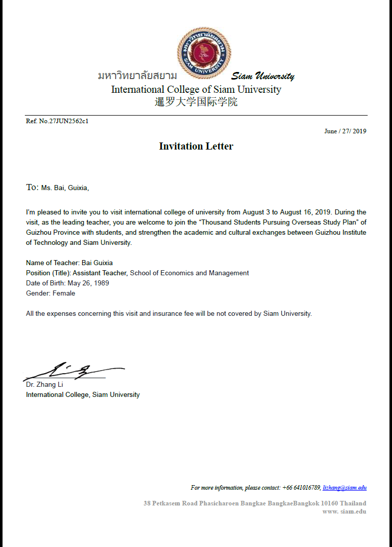 作为贵州理工学院参加2019年贵州省“千人留学计划”学生的带队教师赴泰国暹罗大学 |