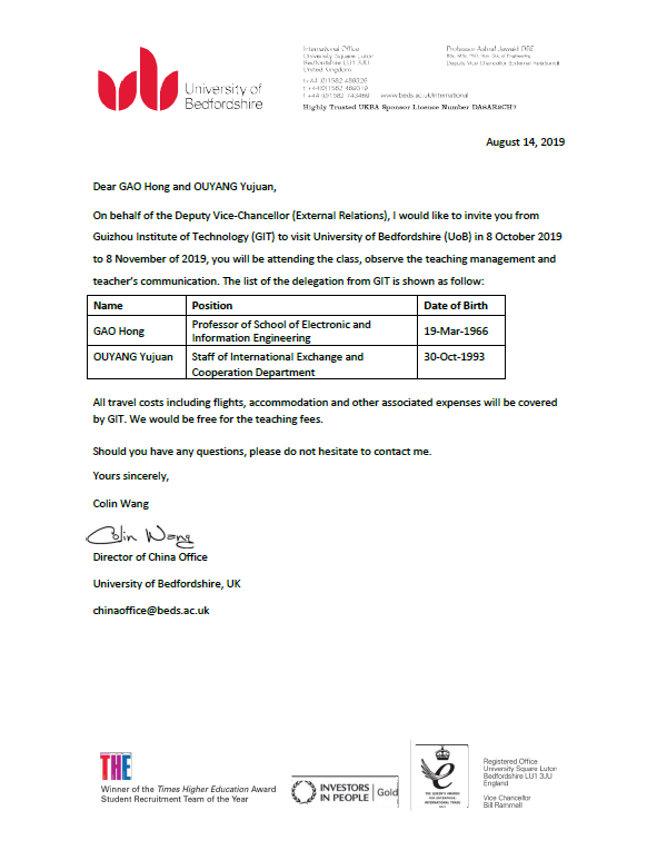 “贵州理工学院中外合作办学项目——贵州理工学院与英国贝德福特大学电气工程及其自动化专业本科教育”选派教师赴英国贝德福特大学进行交流学习 |