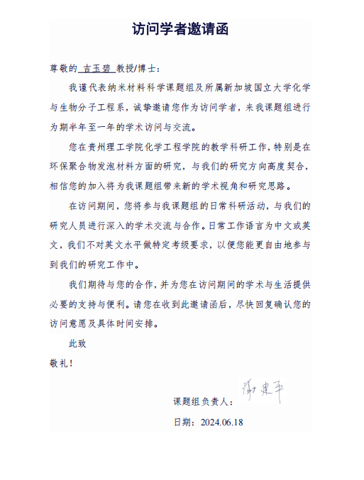 在新加坡国立大学化学与生物分子工程系进行访学,与学术主持人谢建平教授进行交流,开展生物质基纳米复合材料研究和应用相关工作。 |