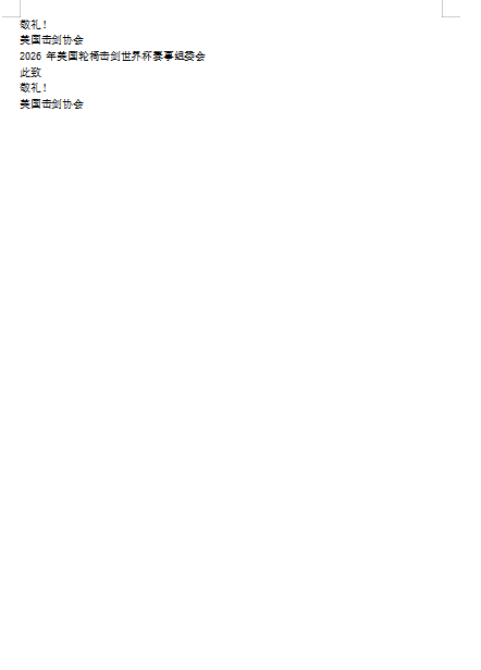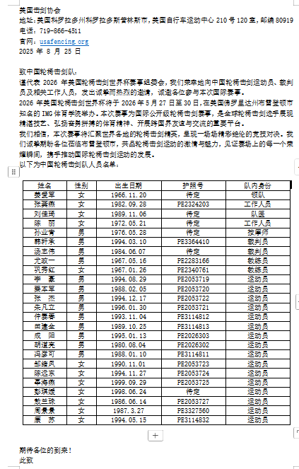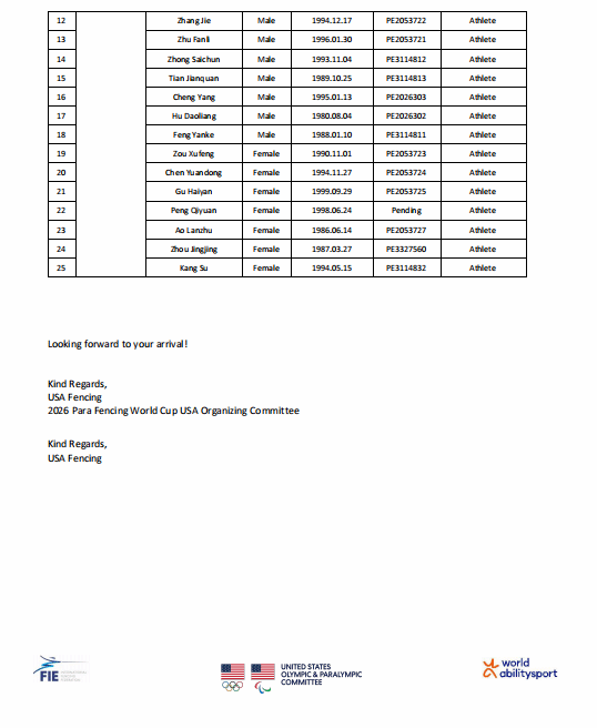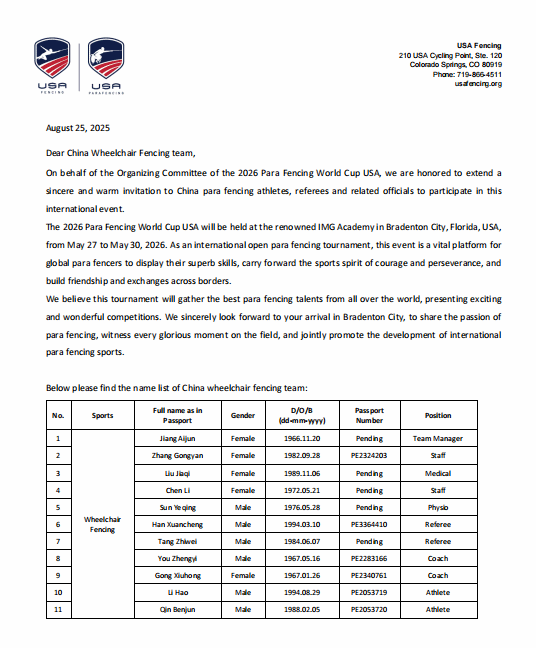 美国 | 参加中国残疾人联合会团组赴美国担任2026年美国轮椅击剑世界杯裁判员。 |