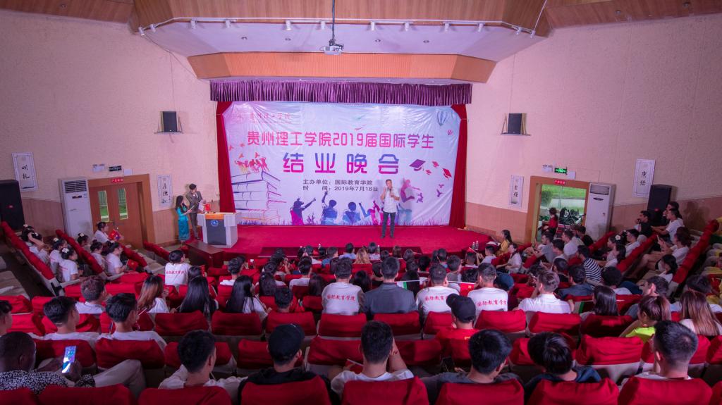 2019年7月17日,贵州理工学院国际教育学院2019届国际语言生结业晚会在逸夫小礼堂隆重举行。贵州理工学院副院长宋建波、国际教育学院党总支书记孙凯、国际教育学院院长乔靖以及国际教育学院全体师生参加了结业晚会。