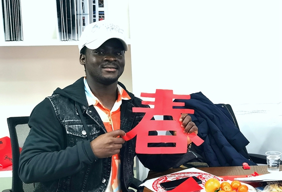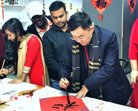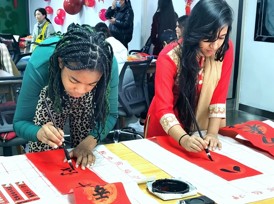 喜欢书法的几内亚留学生玛利亚说:“贴春联有美好期盼和祝福的寓意,我要把自己写的春联贴在宿舍门上。”