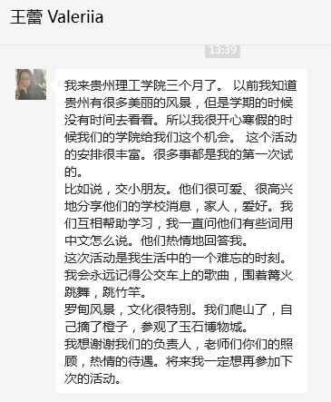 20日下午,在贵州理工学院举行了冬令营结营颁奖仪式上,国际学生们纷纷表示,通过参加此次冬令营活动,收获友谊的同时,还了解了更多有关岩溶碳汇的知识,是一次宝贵的文化交流的机会。今后国际教育学院将继续组织国际学生参加此类活动,积极搭建文化交流的平台,促进中外学生文化交流,讲好中国故事,传播好中国声音。
