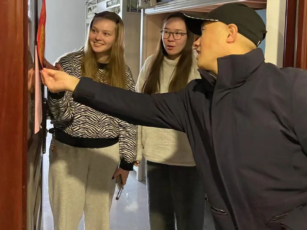 2025年1月26日上午,贵州理工学院国际教育学院党总支书记吴维义、副院长徐丽丹、学生科老师代清萌,走进国际学生宿舍,开展了一场温馨的送春联慰问活动。