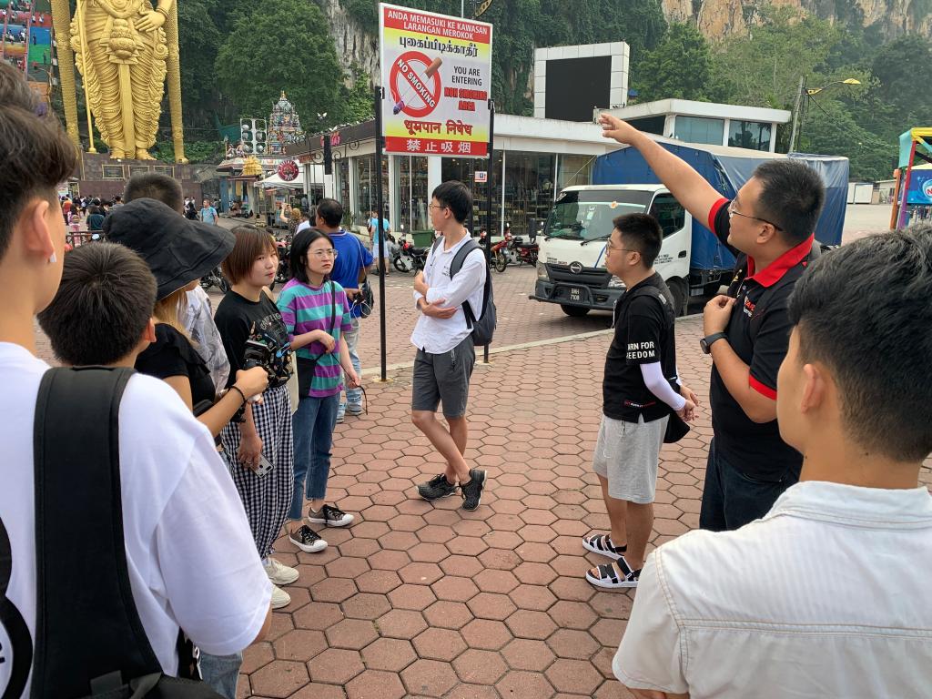 印度人是马来西亚的第三大种族,因此在马来西亚也居住了很多的印度教徒,我们首先来到了距离吉隆坡中心约13公里的黑风洞(Batu Caves),而黑风洞则是马来西亚的印度教圣地。拉曼大学的戴老师介绍到,黑风洞建于1891年,洞口金身的佛像便是黑风洞供奉着苏巴玛廉神,该佛像也是除印度外世界上最大的苏巴玛廉神雕像,此外还有成百上千的彩绘神像也放置于洞内。每年1月底到2月初的大宝森节期间,虔诚的印度教徒会背负神像,唱着宗教圣歌游行进入石洞参拜,朝圣者可达30万人左右,如今,黑风洞也演变成了吉隆坡市区内非常著名的景点之一。黑风洞涵盖了几个洞穴,其洞穴主庙的天花板之高度超过 100 米,每个欲抵达此庙者,皆必须攀登拥有 272 梯级的陡峭阶梯,我校一行人也在戴老师的带领下爬上楼梯,进入到洞穴内部进行参观,同行的有部分学习地质勘测、环境工程、土木工程的同学也对该洞的构造以及形成历史提出了不少问题。